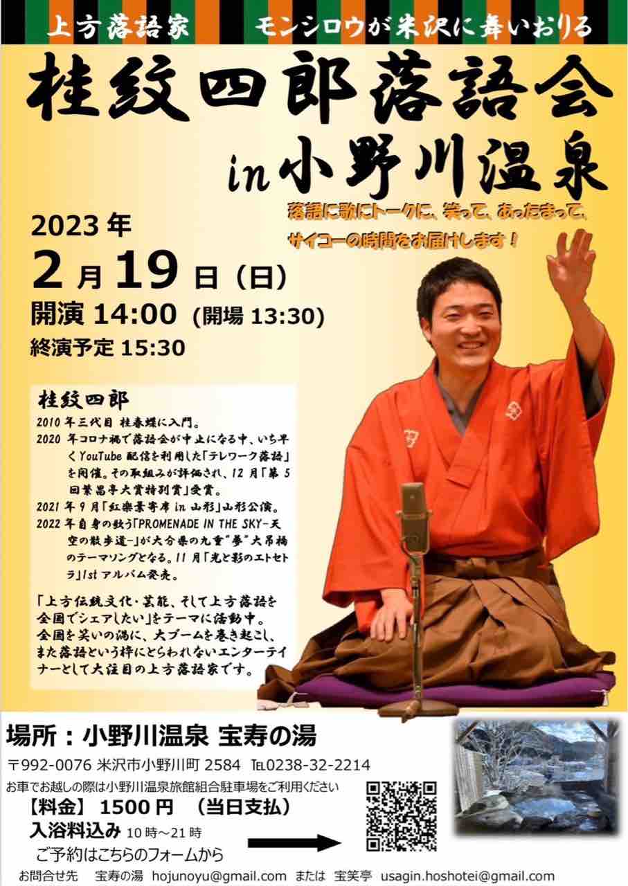 2023年01月07日 【落語会情報】桂紋四郎落語会in小野川温泉 数々の先進的なお取り組みをされ、「繁昌亭大賞特別賞」も受賞されている桂紋四郎さんによる落語会が米沢・小野川温泉にて開催されます!日時:2023/2/19(日)14:00開演場所:小野川温泉宝寿の湯木戸銭:1500円(日帰り入浴付き)詳細はチラシをご覧ください。
