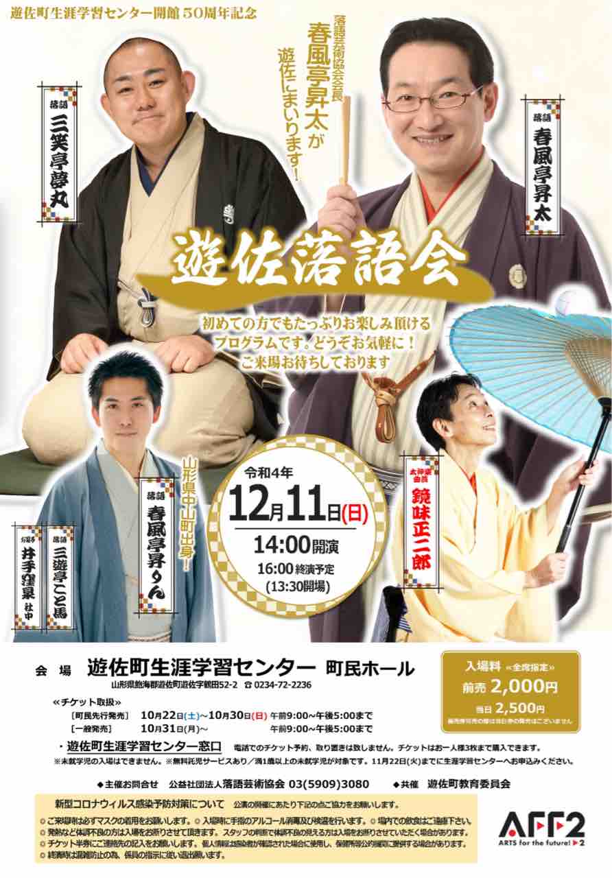 2022年10月10日 【落語会情報】遊佐落語会 日時:2022年12月11日(日)14:00開演会場:遊佐町生涯学習センター町民ホール木戸銭:前売2000円(当日2500円)遊佐町にて昇太師匠、夢丸師匠、昇りんさんら、豪華メンバーの落語会が開催されます!※完売となりました 「落語会情報」カテゴリの最新記事