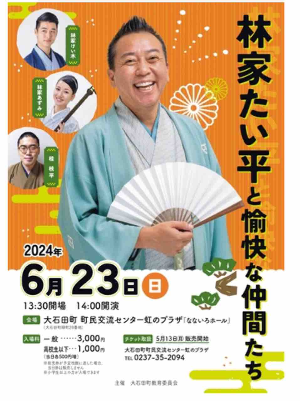 2024年05月26日 【落語会情報】林家たい平と愉快な仲間たち たい平一門大集合!あかね噺監修のけい木さん、女流大喜利でもおなじみあずみさん、前座の枝平さんがいらっしゃいます!日時:2024年6月23日(日)14:00開演会場:大石田町町民交流センター虹のプラザ「なないろホール」木戸銭:3000円、高校生以下1000円、当日+500円 「落語会情報」カテゴリの最新記事