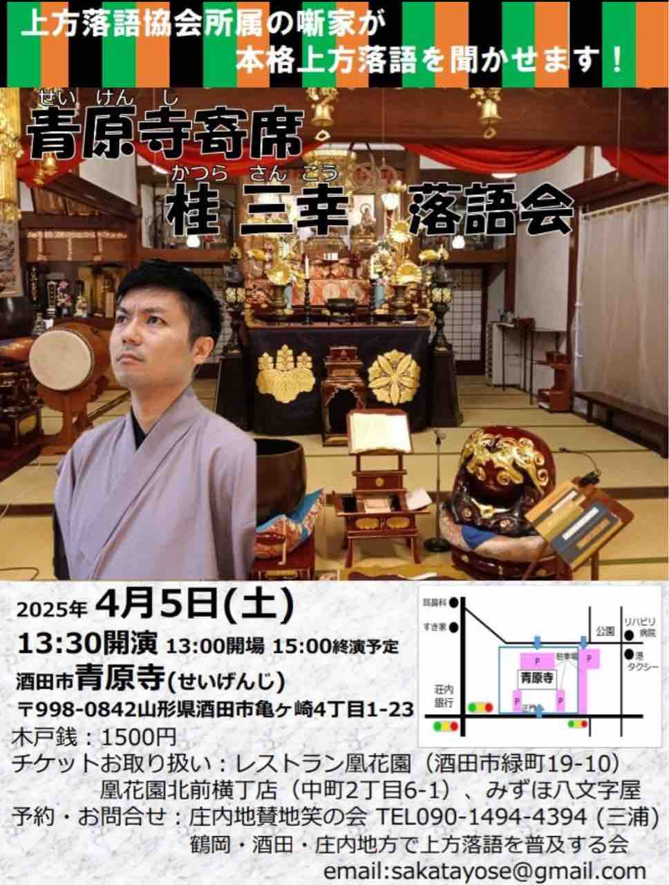 2025年03月06日 【落語会情報】青原寺寄席桂三幸落語会 桂三幸庄内ツアー、初日一発目は青原寺さんから!日時:2025年4月5日(土)13:30開演会場:酒田市 青原寺(せいげんじ)木戸銭:1500円 「落語会情報」カテゴリの最新記事
