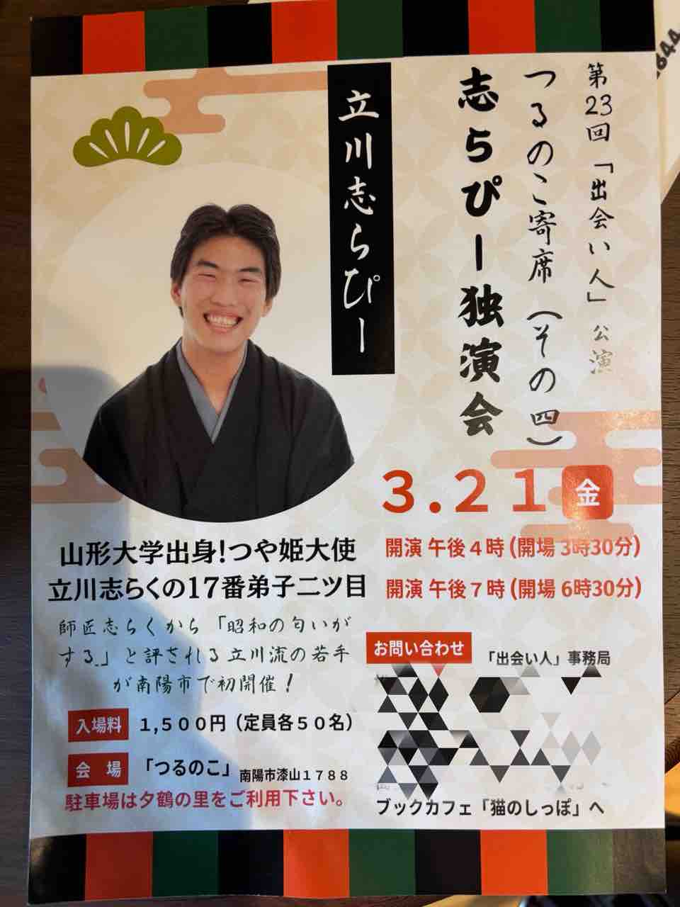2025年03月20日 【落語会情報】つるのこ寄席立川志らぴー独演会 シェアスペースつるのこさんにて立川志らぴーさんの独演会が開催されます!前日のお知らせとなりましたが、お近くの方是非足をお運び下さい!日時:2025年3月21日(金)16:00,19:00開演(2公演)会場:つるのこ(南陽市漆山1788)木戸銭:1500円お問い合わせは、ブックカフェ「猫のしっぽ」さんへお願いいたします↓(つるのこHP)https://www.tsurunoco.com/services-3 「落語会情報」カテゴリの最新記事