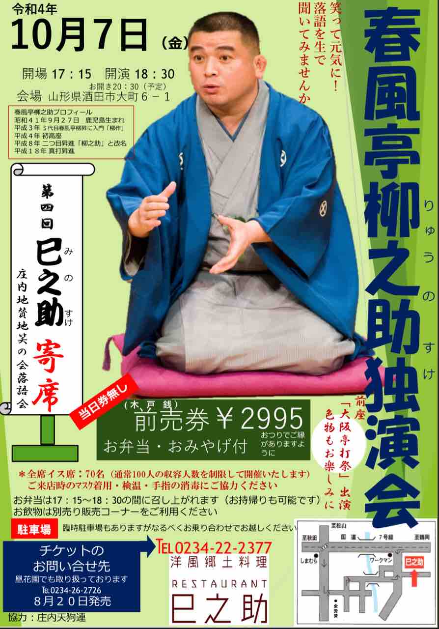 2022年07月06日 【落語会情報】春風亭柳之助独演会(第四回巳之助寄席) 春風亭柳之助さんが酒田にやってきます!お弁当・お土産付きの落語会になります。当日券はございませんので、是非ご予約をお願いいたします!日時:2022年10月7日(金)17:15開場・18:30開演場所:洋風郷土料理巳之助(酒田市大町6-1)木戸銭:2995円(前売のみ、お弁当、お土産付)