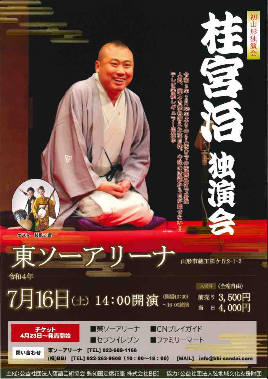 2022年04月10日 【落語会情報】魅知国山形寄席 桂宮治独演会 令和の爆笑王、笑点新メンバーの桂宮治さん山形初の独演会です!いつかは山形にもお越しいただけると思っていましたが意外と早かったですね。・日時:2022年7月16日(土)14:00開演・会場:東ソーアリーナ(山形県山形市蔵王松ヶ丘2-1-3)・料金:3500円(全席自由)※当日4000円チケット販売は4/23(土)より。詳細は東ソーアリーナ様のイベントリンクをご覧ください。http://www.gen.or.jp/event/entry-664.html