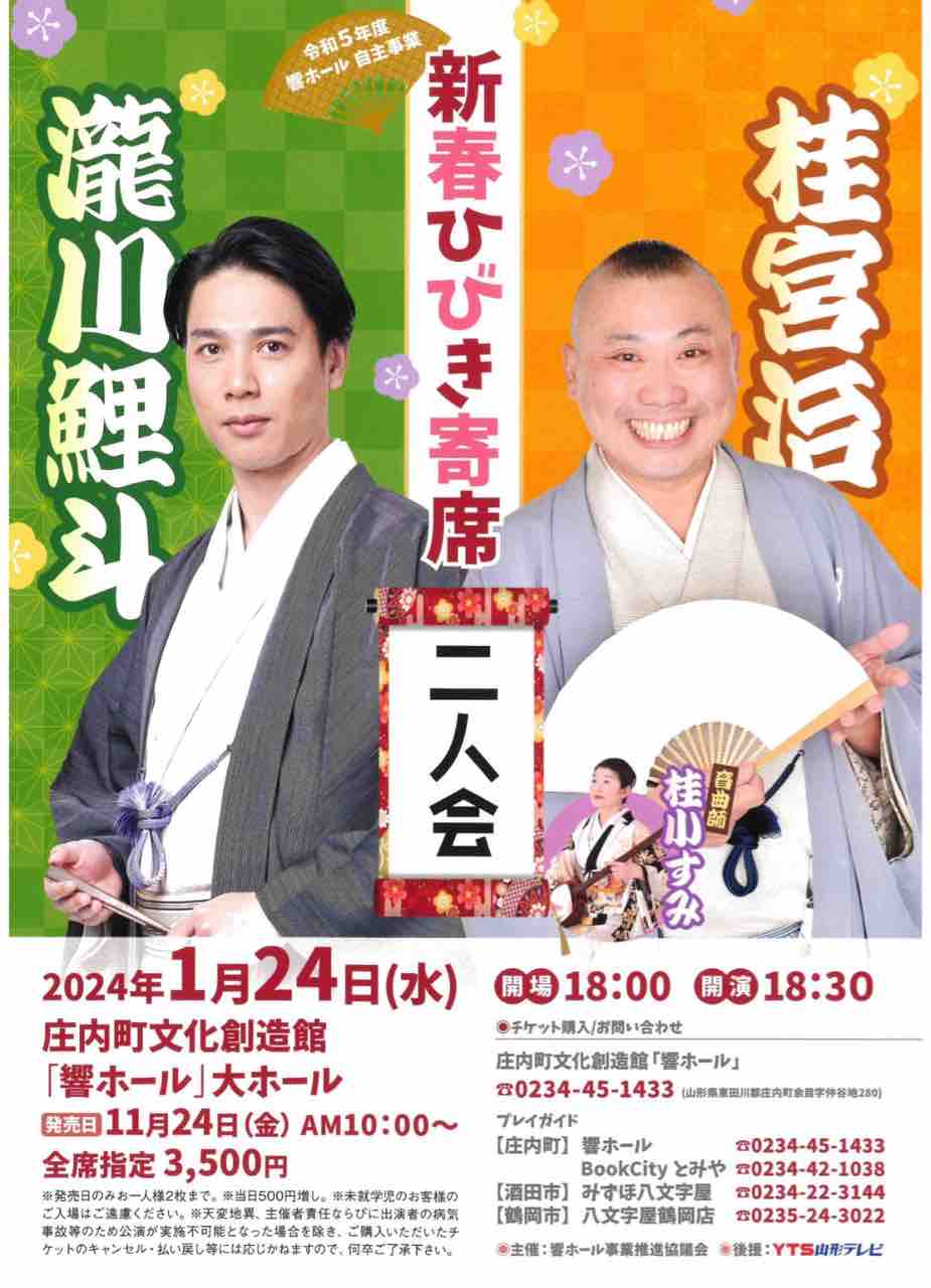 2023年11月29日 【落語会情報】新春ひびき寄席二人会 響ホールでイケメン鯉斗さんとエンターティナー宮治さんの二人会が開催されます!いろいろなところでご活躍の小すみさんも!日時:2024年1月24日(水)18:30開演会場:庄内町文化創造館響ホール木戸銭:全席指定3500円チケットのお求めはチラシをご覧ください。